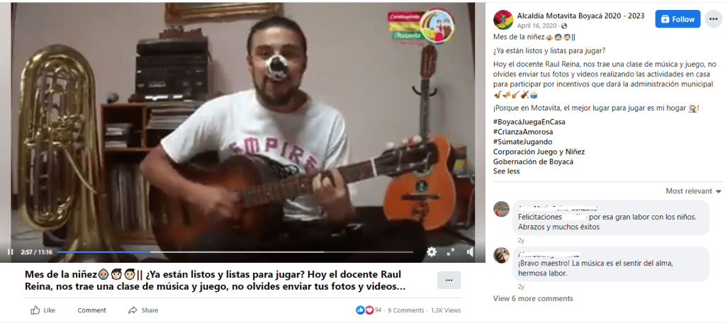 En el año 2020, el año de la pandemia, se trabajo con Alcaldía de Motavita, una población de aproximadamente ocho mil habitantes, a 6 km al noreste de Tunja, en principio la idea era dirigir las agrupaciones del municipio, pero debido a la pandemia se tuvo que recurrir a las clases virtuales y a la creación y producción de material audiovisual y en físico, emitido a través de las redes sociales y emisoras o que llegaba hasta las veredas.
